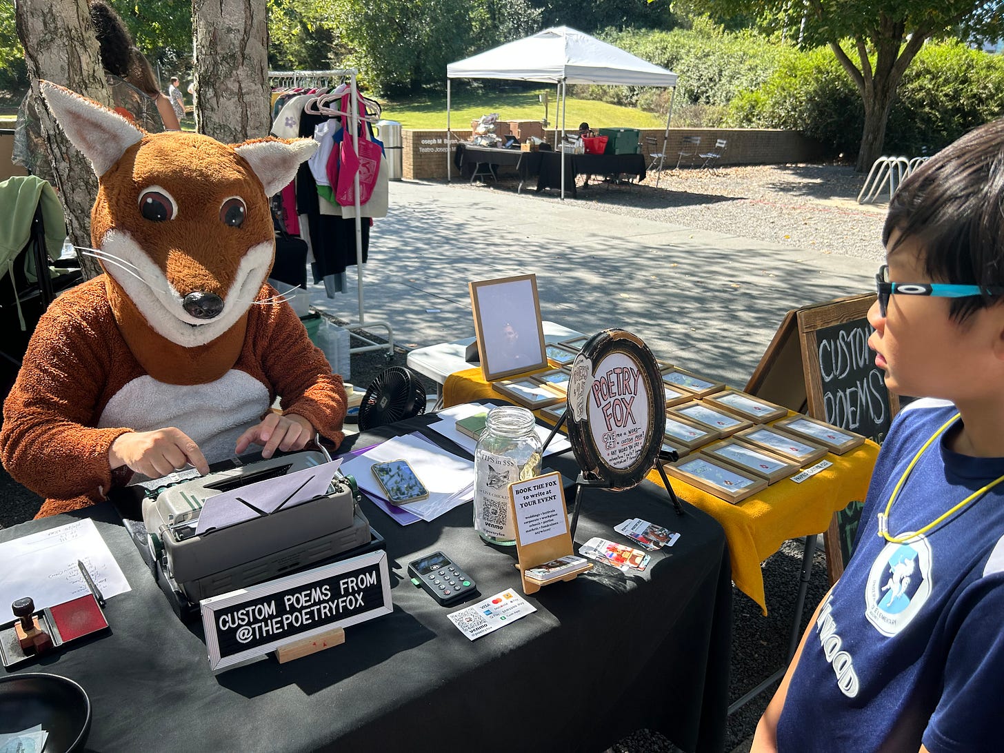 I found this encounter fascinating, not only because I have tried my hand at writing poetry and consistently fallen short of unique and cogent ways to express myself in this confounding art form. But with AI enabling us to write anything from an e-mail to practically whole novels, I have been pondering the future of creative expression and the human experience in the age of AI. I have to admit the encounter with Poetry Fox (née Chris Vitiello) left me feeling optimistic and hopeful for entrepreneurial enterprises in the face of an AI tsunami. While one could argue that AI could generate a poem much faster and maybe more eloquently than Poetry Fox, I’d pay to see a real human dressed in a fox suit banging out poems on a manual typewriter versus a robot-generated AI poem any day! And if you don’t believe me, Poetry Fox is available for booking at your next wedding or social event.